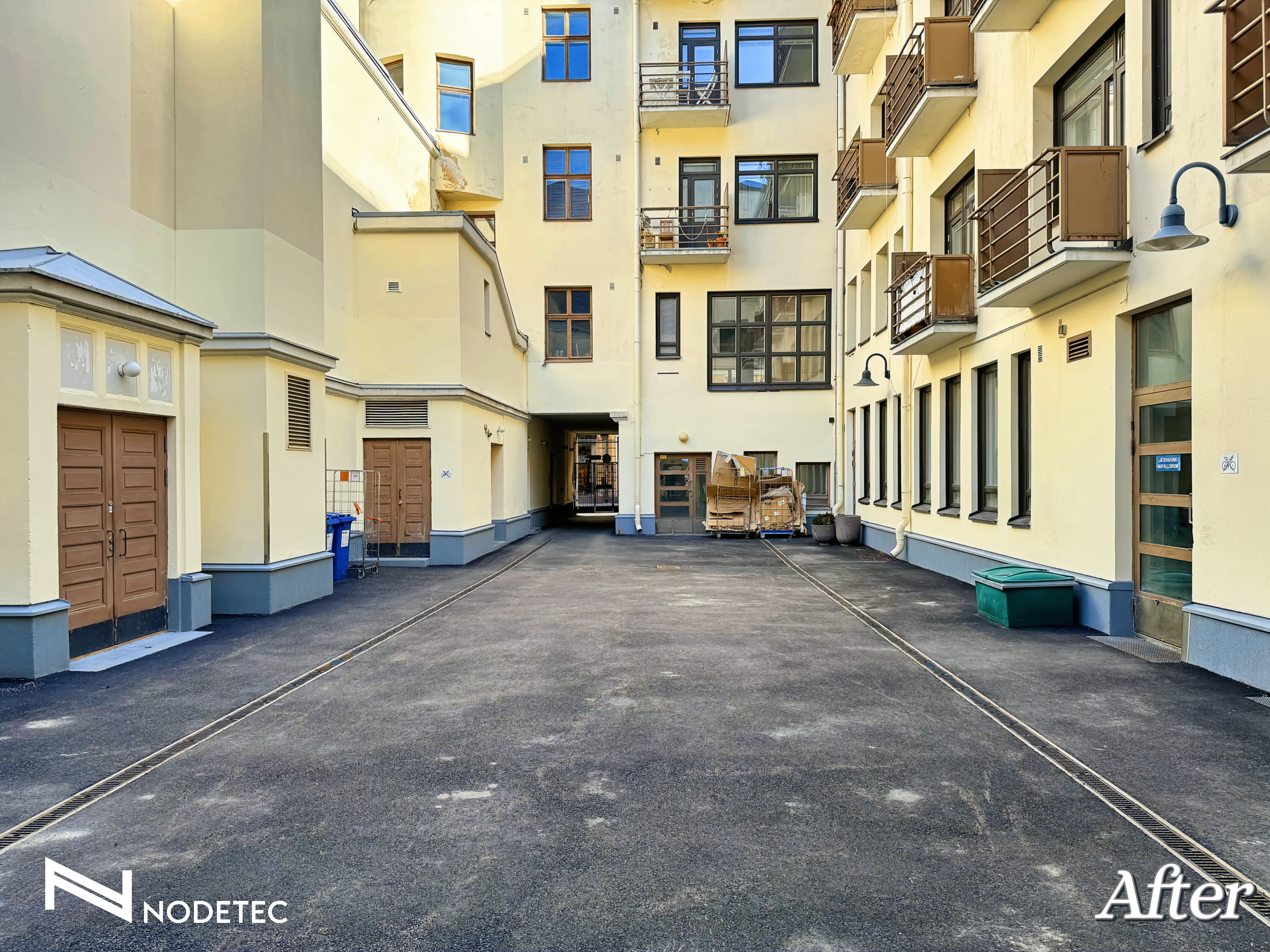 Kahden eri arvokiinteistön yhteisen sisäpihan pihakannen saneeraus. Kuntokartoituksessa todettiin, että paikkakorjaaminen ei tuota pitkäikäistä ja haluttua lopputulosta vuotavalle pihakannelle, jonka takia pihakannen vedeneristys ja pintarakenteet päätettiin uusia kokonaisuudessaan. Rakennukset ovat valmistuneet vuonna 1920 ja 1934 ja pihakansi oli edellisen kerran saneerattu 1990-luvun alussa.