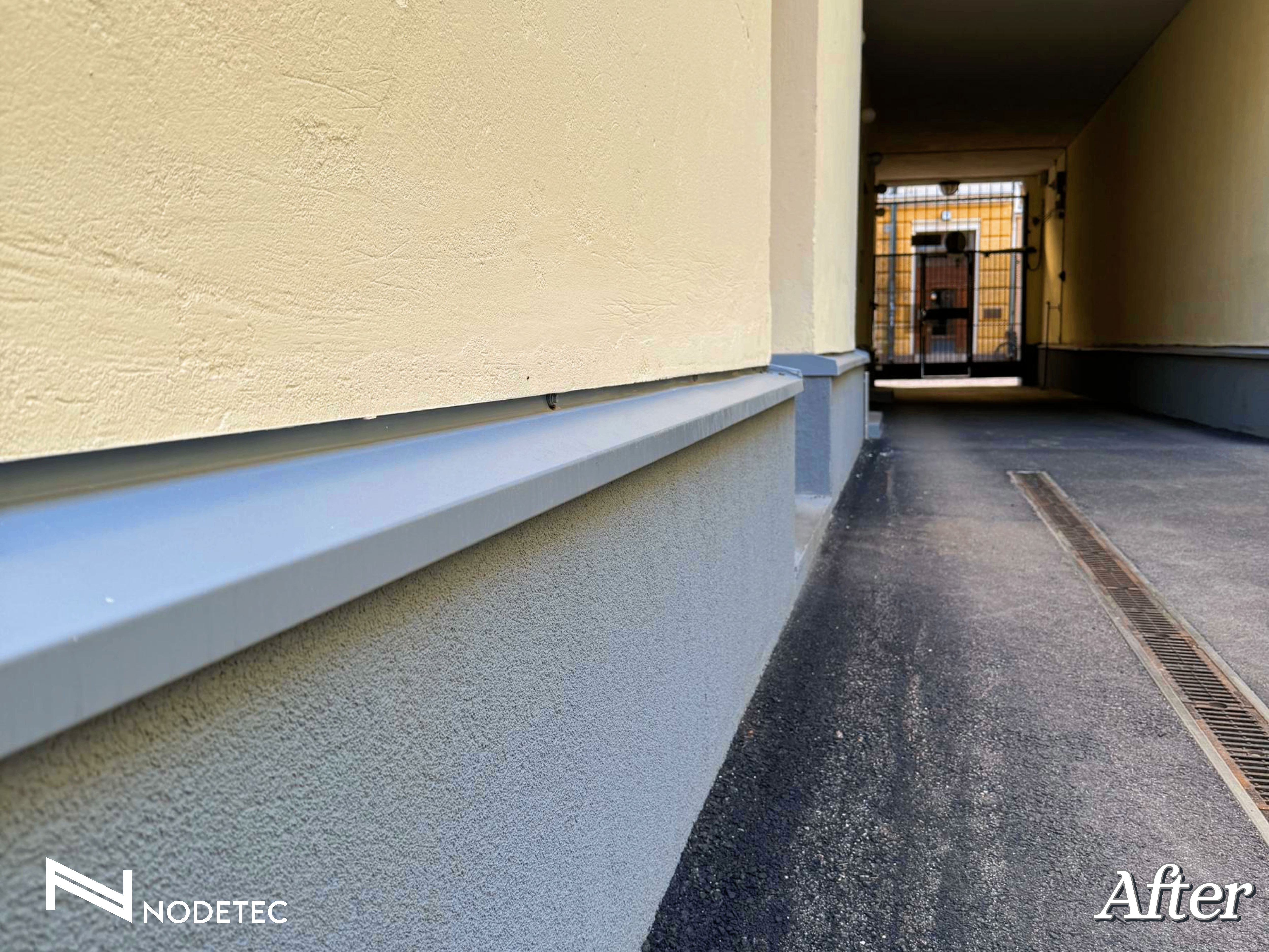 Pihakannen suurimmat vuotoriskit sijoittuvat liittymien kohdalle, jonka takia liittymien toimivuus haluttiin varmistaa. Kyseisen pihakannen liittymien monimuotoisuuden takia vedeneristys päätettiin toteuttaa ruiskutettavalla vedeneristeellä, josta on hyvät kokemukset aiempien hankkeiden osalta. Vanhojen rakennuksien pihakannet ovat aina haastavia sadeveden poisjohtamisen osalta, koska yleisesti pihakannen korkoerot eivät mahdollista riittäviä kallistuksia veden poisjohtamiseksi. Tässäkin kohteessa pienet korkoerot tulivat haasteiksi, jonka takia pihakannella asennettiin linjakuivatuskourut sadeveden poisjohtamiseksi. Pihakannen vedeneriste nostettiin reilusti rakennuksen alkuperäistä sokkelia vasten, jolla vähennetään vesivuodon riskiä. Ylösnoston päälle valettiin betoninen suojavalu, jonka tarkoitus on suojella vedeneristettä mm. mekaanisilta iskuilta. Suojavalu rapattiin ja yläpintaan asennettiin vesipellit, jolloin suojavalu saatiin hämättyä rakennuksen sokkeliksi.