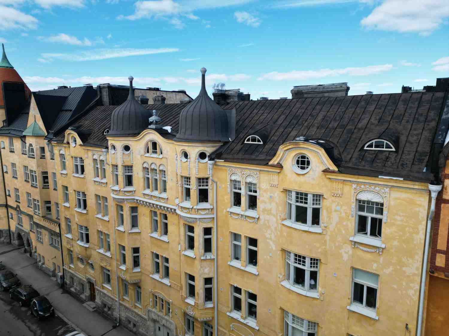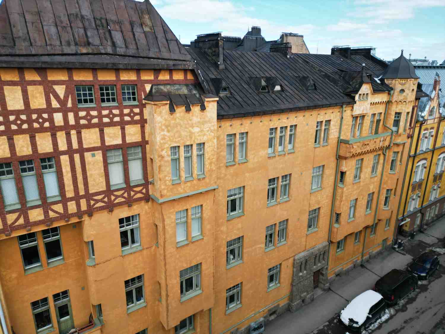 Asemakaavassa suojeltujen rakennuksien julkisivu- ja vesikattosaneeraus, parvekkeiden uusiminen sekä ikkunoiden kunnostustyö. Rakennukset ovat valmistuneet vuosina 1903 ja 1905, alkuperäisenä suunnittelijana arkkitehtitoimisto Polon & Wasastjerna.
